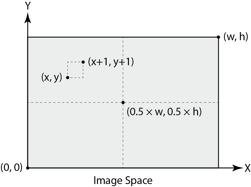 Given normalized \((x, y)\) image coordinates in image space, we want to transform them first into camera space and then into world space in order to generate rays. As described in the equations and image below, \((x, y)\) in image space is mapped to \((x', y')\) in camera space. $$x' = (x - 0.5) \cdot 2 \cdot \tan \Big(\frac{\text{hFov}}{2} \Big)$$ $$y' = (y - 0.5) \cdot 2 \cdot \tan \Big(\frac{\text{vFov}}{2} \Big)$$