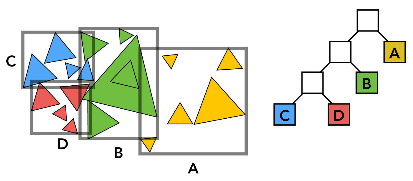 The BVH is a binary tree consisting of internal nodes (that store bounding box and children information) and leaf nodes (that store bounding box information and a list of the bounding box's primitives). The figure below is a simple illustration of this idea; the white nodes represent internal nodes, the colored/labeled nodes represent leaf nodes, and the gray rectangles represent the bounding boxes.