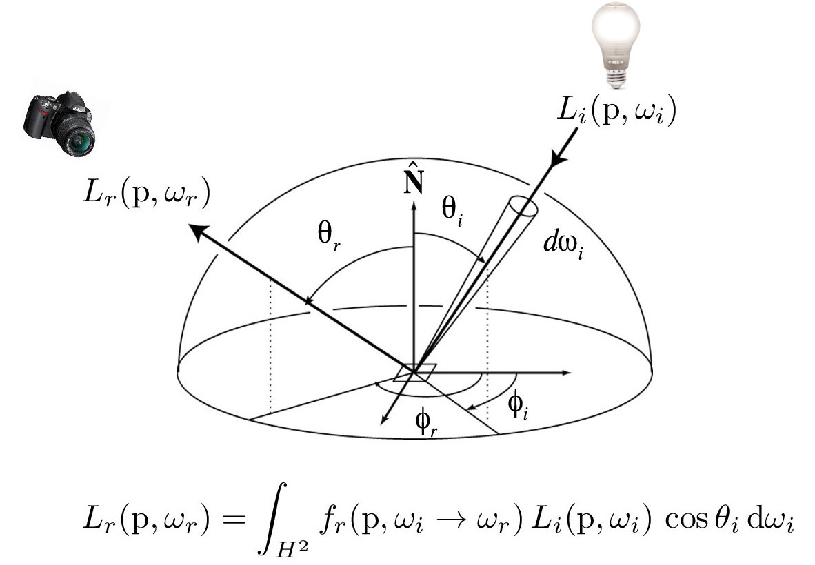The figures below describe the Reflectance Equation (which we approximate using a Monte Carlo estimator) and the BRDF function. In this project, we will only use Diffuse BRDFs, which reflect light equally in all directions on the hemisphere.
