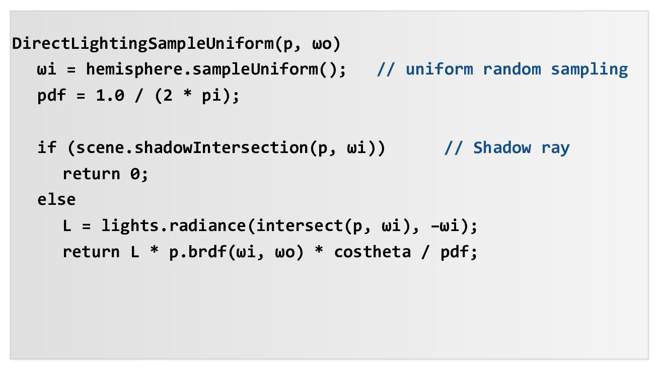 Now that we have an expression that we can use to estimate the outgoing light, we can compute the one bounce radiance. There are two ways to do this: hemisphere sampling and importance light sampling.