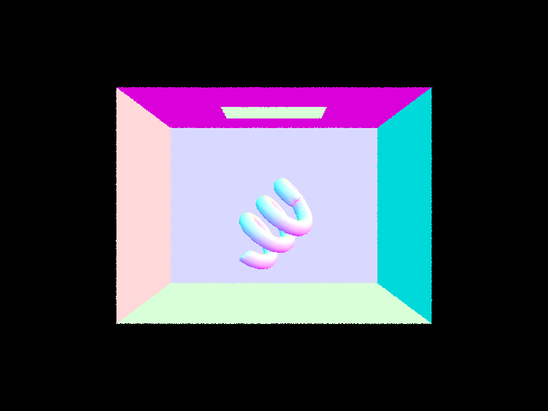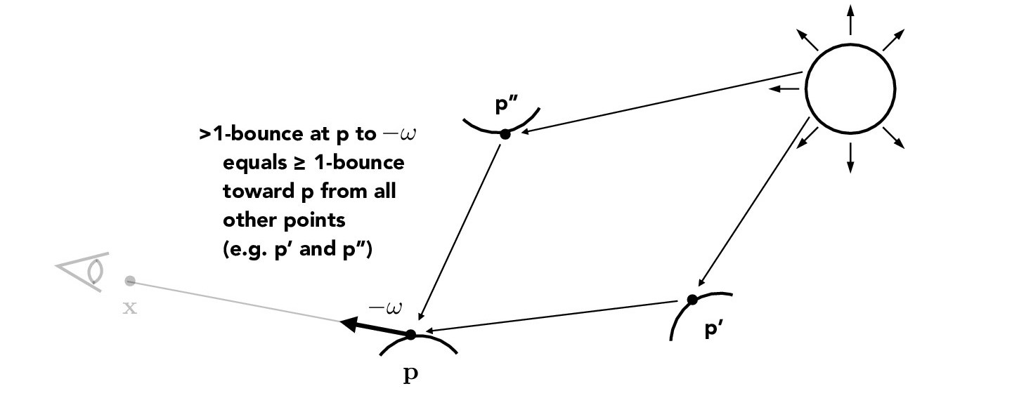 In real life, light is reflected off all sorts of surfaces before reaching our eye. To create richer renders, we render scenes with global illumination, which requires us to implement indirect lighting. Indirect lighting traces multi-bounce rays, as shown below.